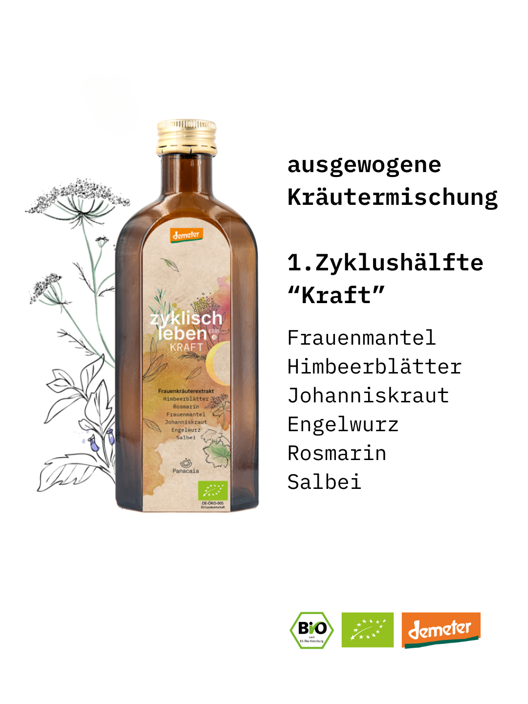 Unser umfassend-abgestimmter Zyklustee “Kraft” von Panacaia unterstützt dich dabei, deine erste Zyklushälfte, die Phase der Kreativität, gestärkt in deiner inneren Mitte zu erleben.